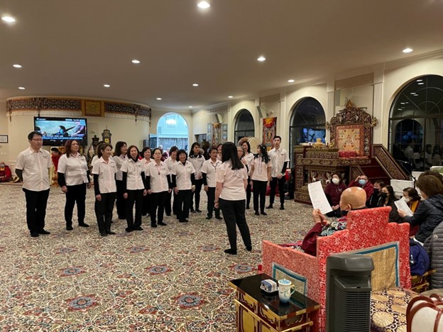 美國天音雅樂合唱團首次登台獻唱供佛,此次表演最令人驚喜讚嘆的是由我們的 師尊親自擔任指揮,團員們欣喜萬分,更增士氣,個個精神昂揚,聲音響亮有勁。此次登台演唱了兩首曲子:「蓮花燈」、「祝福」。