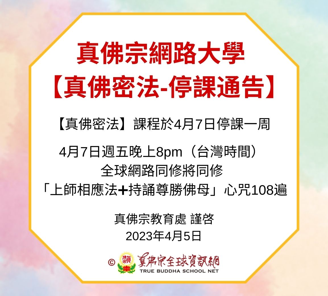 【真佛密法-停課通告】 阿彌陀佛大家吉祥 真佛宗網路大學 【真佛密法】課程於4月7日停課一周。 4月7日週五晚上8pm(台灣時間)全球網路同修將同修「上師相應法+持誦尊勝佛母」心咒108遍。 請大家參加宗委會持咒活動,持誦《尊勝佛母》心咒迴向給我們敬愛的師尊。 尊勝心咒 迴向聖尊 除病消災 身心安樂 真佛宗教育處 謹啓 2023年4月5日