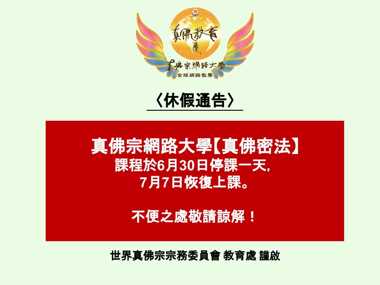 休假通告-真佛網路大學【真佛密法】課程於6月30日停課一天