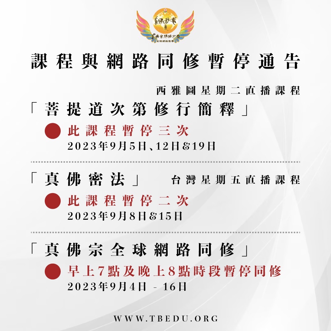 阿彌陀佛大家吉祥,為配合根本傳承上師蓮生活佛 於西雅圖所主壇的【秋季阿彌陀佛護摩大法會】活動,真佛宗網路大學第二門課《菩提道次第修行淺釋》、第四門課《真佛密法》及《真佛宗全球網路同修》將在以下時段暫時停課及同修。