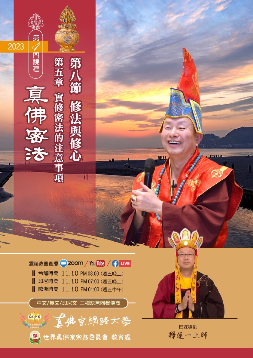 本週五《真佛密法》課程授課導師為大家講授第五章【真佛密法的實修與應用】第八節「修法與修心」,在這一節中佛學造詣深厚的蓮一上師將為我們深度解析: