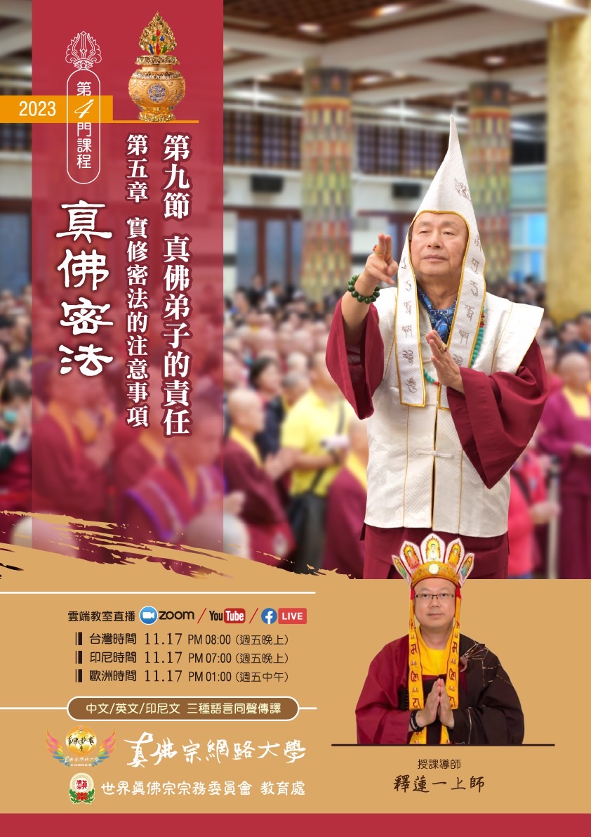 本週五《真佛密法》課程授課導師為大家講授第五章【真佛密法的實修與應用】第九節「真佛弟子的責任」,在這一節中佛學造詣深厚的蓮一上師將為我們深度解析: