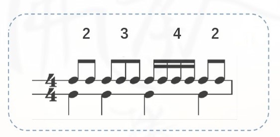 以上图为例,一个以四分音符为一拍的符号,你可以把它分成两个,或是三个,或是四个相同的等分,但是加起来的拍数又都刚好是一拍的形式,但是一个四分音符,你可以把它分割为两个8分音符,或是四个16分音符,称之为基本划分,但是在音乐上并没有任何一种音符可以直接将四分音符等切而为三,所以这个时候我们就要使用连音线,写三个八分音符,然后标上数字3,这样的划分也称之为特殊划分。