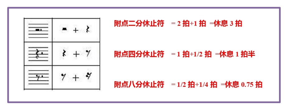 附点八分休止符的拍数,是八分休止符休息半拍加符点(半拍之一半)休息四分之一拍, 共四分之三拍的休息拍长。