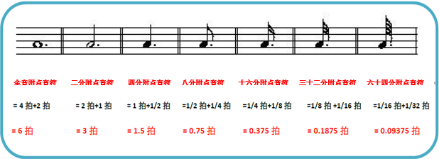 全音符附点音符的拍数,是全音符四拍加符点(四拍之一半)二拍,共六拍的拍长。